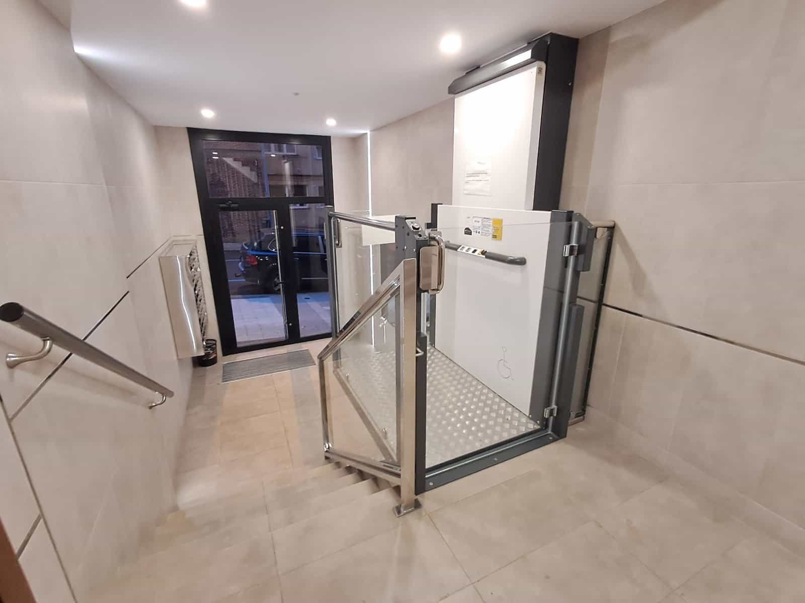 Portal recién reformado con dos ascensores y elevador para personas con movilidad reducida a cota cero.